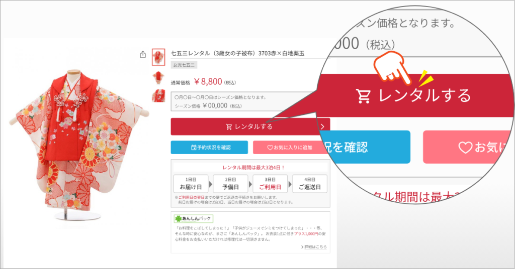 対象の衣装からお気に入りのモノを選び、レンタルの手続きを進めます。