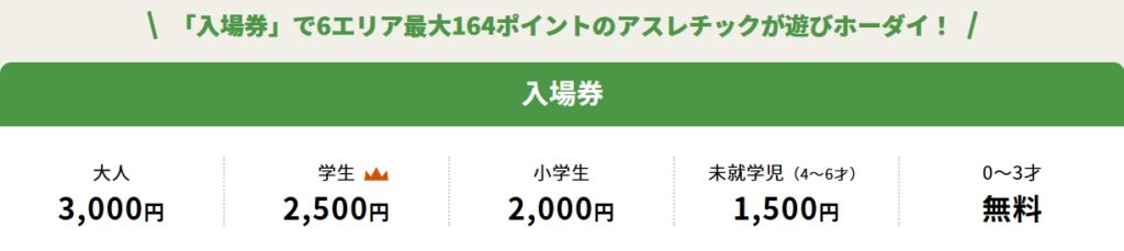 六甲山アスレチックGREENIAの入場料金は、大人3,000円、学生2,500円、小学生2,000円、未就学児1,500円、0~3歳は無料です。