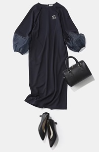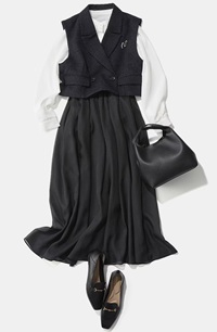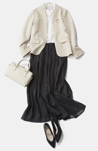 また、ダークカラーのセットアップやワンピースの際に、バッグやパンプスにベージュを取り入れることで、暗くなりすぎず洗練された印象を与えます。