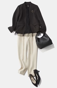 - ベージュの柔らかさを上品に引き締め、きちんと感が出る